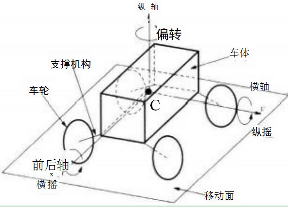 (3)車(chē)輪支撐機(jī)構(gòu):車(chē)輪支撐機(jī)構(gòu)位于車(chē)輪與車(chē)體之間,決定兩者在空間上的 關(guān)系,包括自由度在內(nèi)。車(chē)輪支撐機(jī)構(gòu)承載車(chē)輪以上部分的載荷,并將它分解到各 個(gè)車(chē)輪上,懸掛裝置、緩沖裝置也應(yīng)該包含在車(chē)輪支撐機(jī)構(gòu)之內(nèi)。