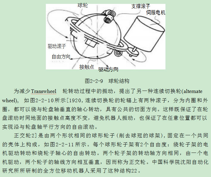球 輪(ball wheel)由一個(gè)滾動(dòng)球體、 一組支撐滾子和一組驅(qū)動(dòng)滾子組成,其中 支撐滾子固定在車底盤上,驅(qū)動(dòng)滾子固定在一個(gè)可以繞球體中心轉(zhuǎn)動(dòng)的支架上,如 圖2-2-9所示15.16]。每個(gè)球輪上的驅(qū)動(dòng)滾子由一個(gè)電機(jī)驅(qū)動(dòng),使球輪繞驅(qū)動(dòng)滾子 所構(gòu)成平面的法線轉(zhuǎn)動(dòng),同時(shí)可以繞垂直的軸線自由轉(zhuǎn)動(dòng)。輪子的驅(qū)動(dòng)力是滾子 和輪子的摩擦力,使得輪子的驅(qū)動(dòng)力和速度受到限制,這也是球輪的缺點(diǎn)。同時(shí), 輪子在地面滾動(dòng)過(guò)程中吸附的一些灰塵,會(huì)在輪子和滾子的接觸點(diǎn)積累,影響兩者 之間的摩擦力,使輪子打滑,我們?cè)谑褂脻L動(dòng)鼠標(biāo)時(shí)都會(huì)有同樣的感受。因而,對(duì) 球輪的改進(jìn)方法是有效增加滾子和球體之間的摩擦驅(qū)動(dòng)力。