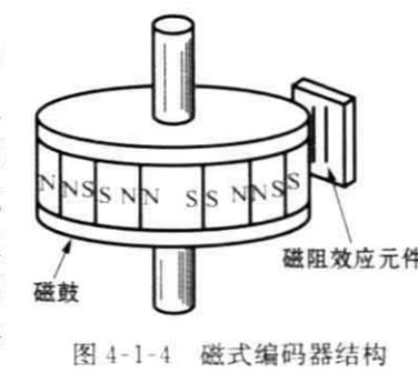 磁式編碼器是通過在強磁性材料表面上等 間隔的磁化刻度標尺,標尺旁邊相對放置磁阻 效應元件或霍爾元件,即能檢測磁通的變化,如 圖4-1-4所示,兩個磁傳感器的距離恰好是磁化 標尺間隔的1/4. 因此可以根據(jù)輸出信號的相位 關系檢測旋轉方向。與光學編碼器相比,磁式編 碼器的刻度間隔大,但它具有耐油污、抗沖擊等 特點。