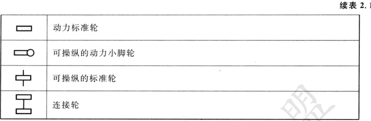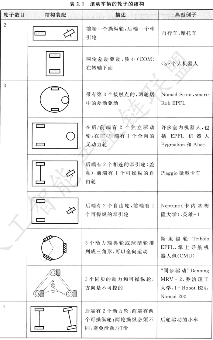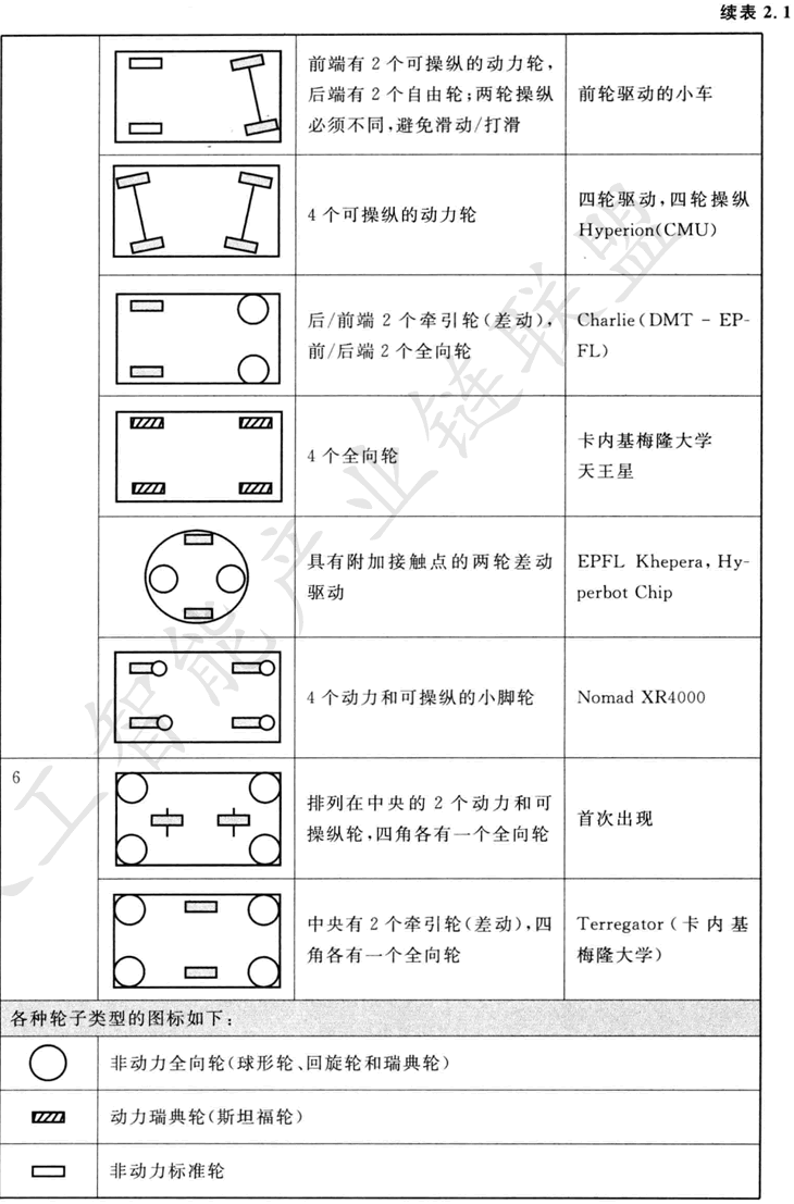 表2.1給出了輪子結(jié)構(gòu)的概貌,按輪子數(shù)目排序。表中描述了特殊輪子類型的選擇和機(jī)器人底盤(pán)上它們的幾何結(jié)構(gòu)這兩個(gè)方面。我們注意到,所示的某些輪子結(jié)構(gòu)在移動(dòng)機(jī)器人的應(yīng)用中很少用到。例如,兩輪自行車裝配,其機(jī)動(dòng)性中等,可控性 差。再像單腿跳躍機(jī),它根本不能靜止地站著。不過(guò),表中提供了在運(yùn)動(dòng)機(jī)器人設(shè)計(jì) 中可能用到的許多種類輪子結(jié)構(gòu)的說(shuō)明。