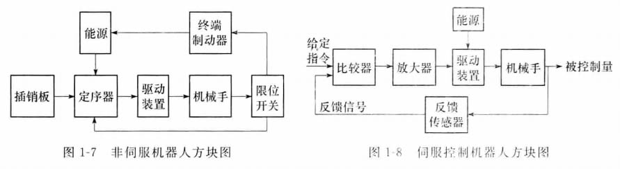 伺服控制機(jī)器人(servo-controlled robot)比非伺服機(jī)器人有更強(qiáng)的工作能力,因而價(jià)格較貴,但在某些情況下不如簡單的機(jī)器人可靠。圖1-8表示伺服控制機(jī)器人的方塊圖。 伺服系統(tǒng)的被控制量(輸出)可為機(jī)器人端部執(zhí)行裝置(或工具)的位置、速度、加速度和力 等。通過反饋傳感器取得的反饋信號與來自給定裝置(如給定電位器)的綜合信號,用比較器加以比較后,得到誤差信號,經(jīng)過放大后用以激發(fā)機(jī)器人的驅(qū)動(dòng)裝置,進(jìn)而帶動(dòng)末端執(zhí) 行裝置以一定規(guī)律運(yùn)動(dòng),到達(dá)規(guī)定的位置或速度等。顯然,這就是一個(gè)反饋控制系統(tǒng)。
