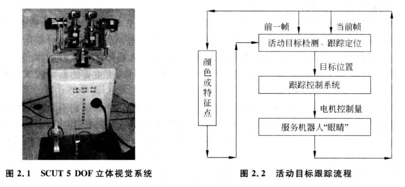 圖2.1所示的服務(wù)機(jī)器人“眼睛”是一個(gè)5 DOF 立體視覺系統(tǒng),它能夠跟蹤和識(shí)別活 動(dòng)的目標(biāo)。它是由 SCUT “智能計(jì)算機(jī)”科研團(tuán)隊(duì)研制成功的。該“眼睛”包括兩個(gè)彩色 攝像機(jī)、圖像處理板、個(gè)人電腦、數(shù)據(jù)采集卡、5個(gè)直流電機(jī)、直流電機(jī)驅(qū)動(dòng)器。考慮到主 動(dòng)跟蹤和目標(biāo)特征與速度和魯棒性等要求,該“眼睛”以基于顏色的跟蹤算法為基礎(chǔ),結(jié) 合目標(biāo)特征跟蹤及目標(biāo)運(yùn)動(dòng)預(yù)測等就可以對活動(dòng)目標(biāo)進(jìn)行跟蹤和識(shí)別。