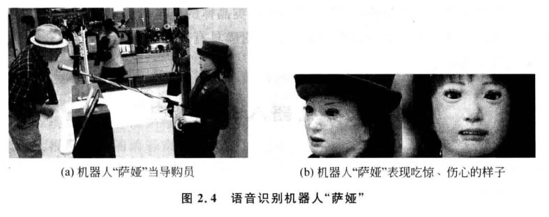 日本著名的東京高島屋商場(chǎng)為了解決顧客排長(zhǎng)隊(duì)購(gòu)物難的問題,引入了一款語(yǔ)音識(shí) 別機(jī)器人“薩婭”當(dāng)導(dǎo)購(gòu)員,如圖2.4所示!八_婭”能夠用超過700種不同的語(yǔ)音方式對(duì) 購(gòu)物者的問題和投訴做出反應(yīng),它會(huì)告訴顧客去哪層樓能夠買到他們所需的商品,還能 和他們閑聊幾句,但是有時(shí)也會(huì)無法“溝通”。曾有一位記者問“薩婭”問題,可能是因?yàn)? 他口音太重,“薩婭”聽不懂,一直指著洗手間的方向,無法告訴記者所要去的商場(chǎng)樓層。 雖然“薩婭”的面部動(dòng)作還存在一些不足,但是它表現(xiàn)高興、傷心或生氣時(shí)是很逼真的。 盡管“薩婭”是一個(gè)語(yǔ)音識(shí)別服務(wù)機(jī)器人,但是它像其他日本人那樣講禮貌,彬彬有禮。
