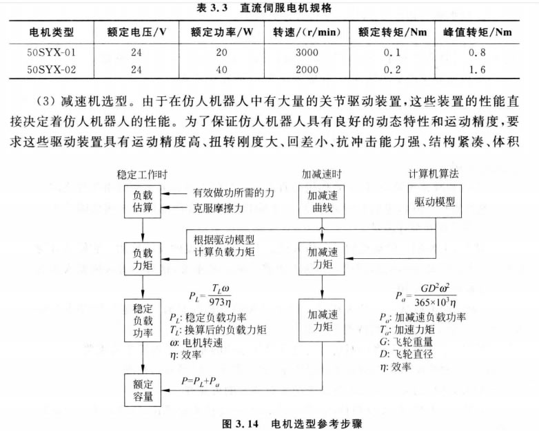 電機(jī)是將電能轉(zhuǎn)化為機(jī)械能的部件,由此發(fā)生的力經(jīng)過(guò)以減速器為核心的動(dòng)力傳遞 系統(tǒng)到達(dá)負(fù)載端。在此過(guò)程中, 一部分力克服摩擦,以熱能的形式耗散出去,因此傳動(dòng)效 率無(wú)法達(dá)到100%。在實(shí)際設(shè)計(jì)中,應(yīng)該將上述路線的順序倒過(guò)來(lái),即以負(fù)載的大小和摩 擦系數(shù)及運(yùn)動(dòng)效率去推算電機(jī)的容量。施加于電機(jī)的負(fù)載大致可以劃分成三種基本類 型:有效力、無(wú)效力、慣性力。智能交互機(jī)器人的驅(qū)動(dòng)器大致有直流電機(jī)、步進(jìn)電機(jī)、舵機(jī)。如 圖3.14所示為電機(jī)選擇的方法和步驟。從圖中可知,決定電機(jī)容量時(shí),涉及負(fù)載估算、 驅(qū)動(dòng)對(duì)象運(yùn)動(dòng)規(guī)律確定、傳動(dòng)系統(tǒng)轉(zhuǎn)動(dòng)慣量折算等內(nèi)容[96]。